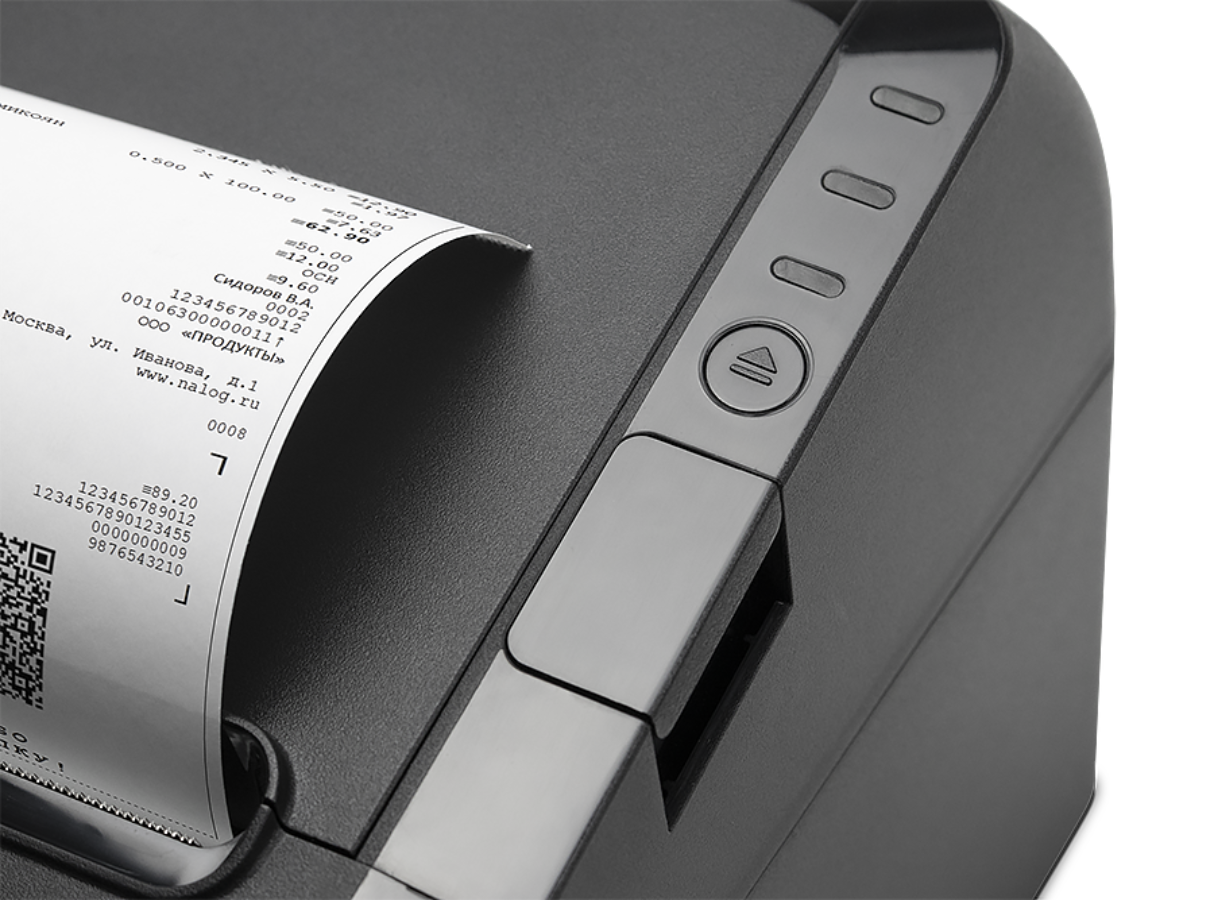 Удобно для кассира. Заменить чековую ленту легко: одно нажатие кнопки — и подпружиненная крышка откроется полностью, без риска травмы пальцев кассира. АТОЛ 27Ф удобен для кассовой зоны самообслуживания за счет рулонной подачи чековой ленты.
