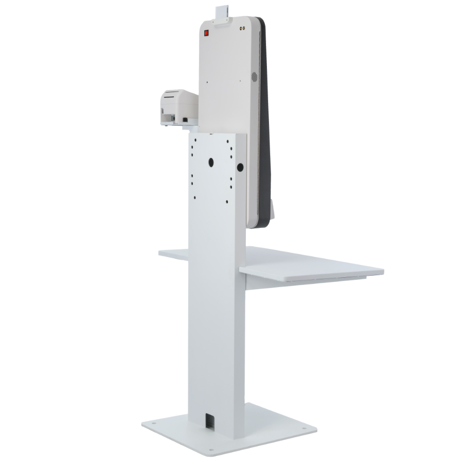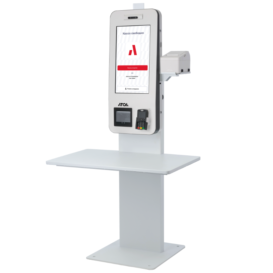 Компактное расположение. Касса подходит для компактного острова самообслуживания. Ее можно установить на напольную, настольную стойку или тумбу. Крепления позволят расположить периферийные устройства так, чтобы соблюдался баланс удобства для покупателя и экономии пространства.