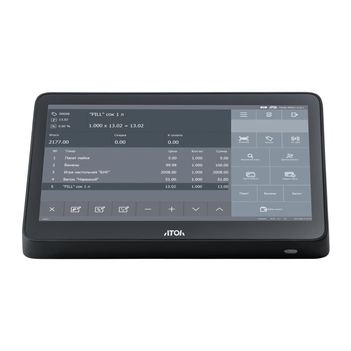 Работа с самым популярным торговым ПО. Универсальная платформа Intel позволяет установить на POS-терминал любую популярную программу для розничной торговли, общественного питания, сферы услуг: Frontol, iiko, R-Keeper, 1C и др. Для быстрой и высокопроизводительной работы терминал комплектуется 8 ГБ оперативной памяти и внутренним накопителем 128 ГБ. Этого достаточно для ресурсоёмких товароучётных приложений.